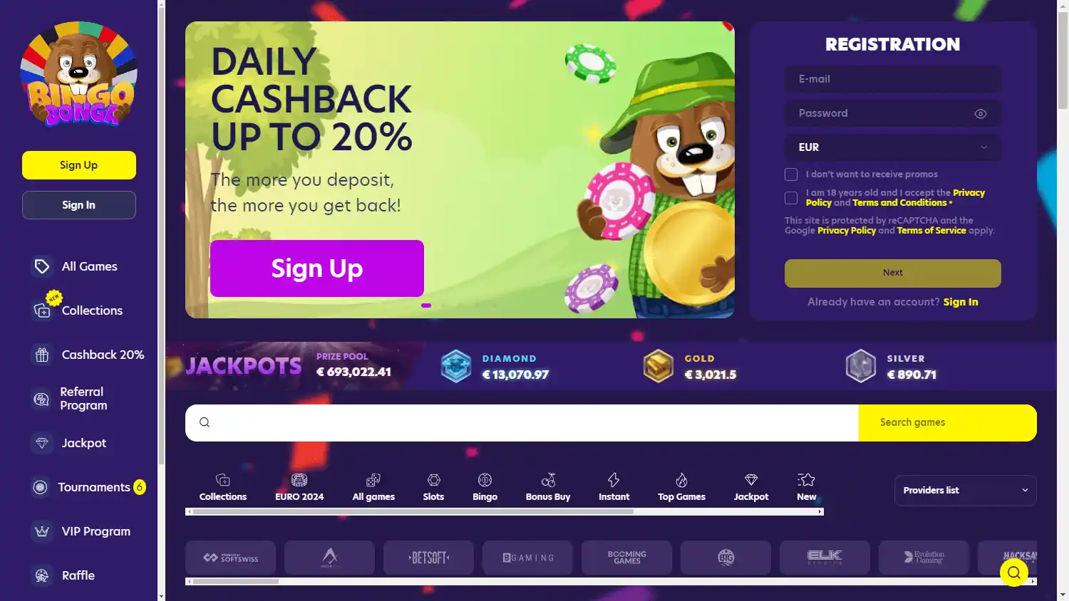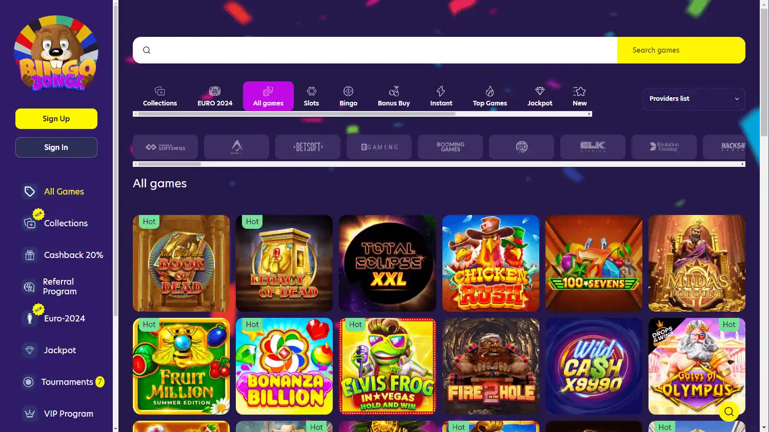 — Jogos: Slots, roleta, blackjack, baccarat, jogos ao vivo e mais de 80 provedores