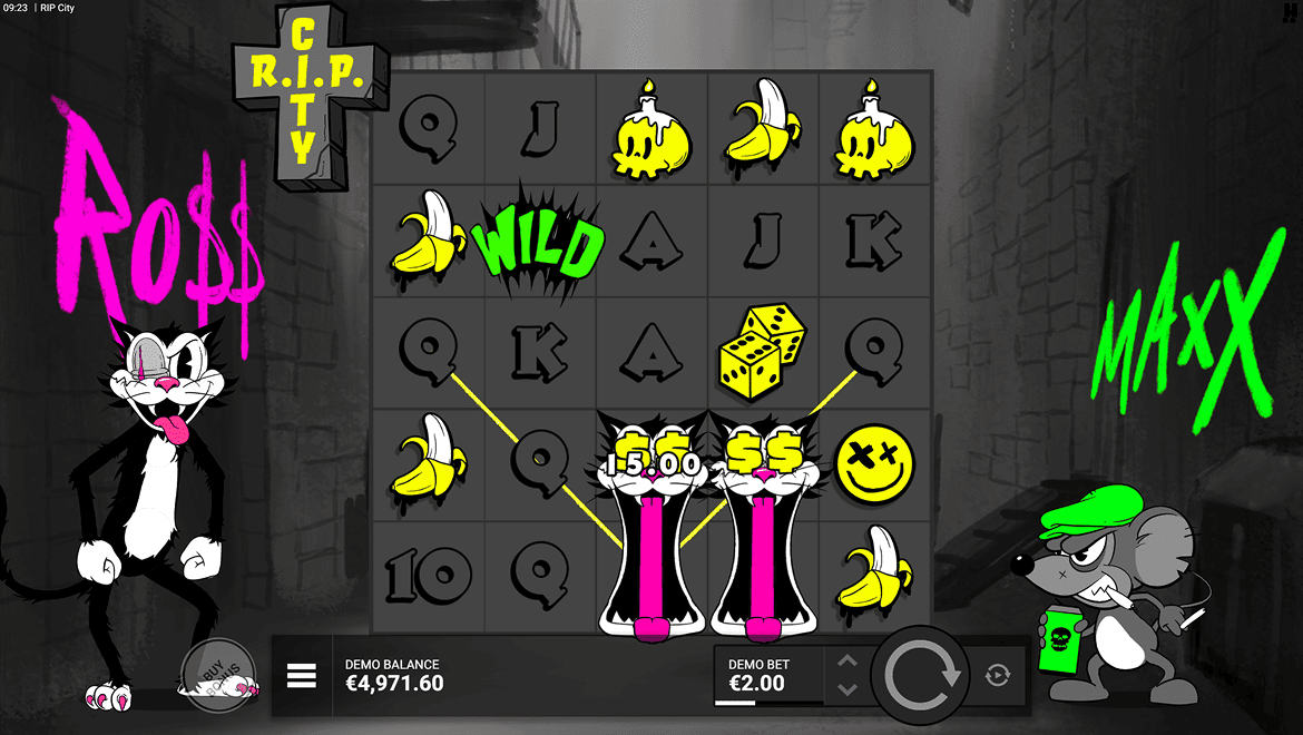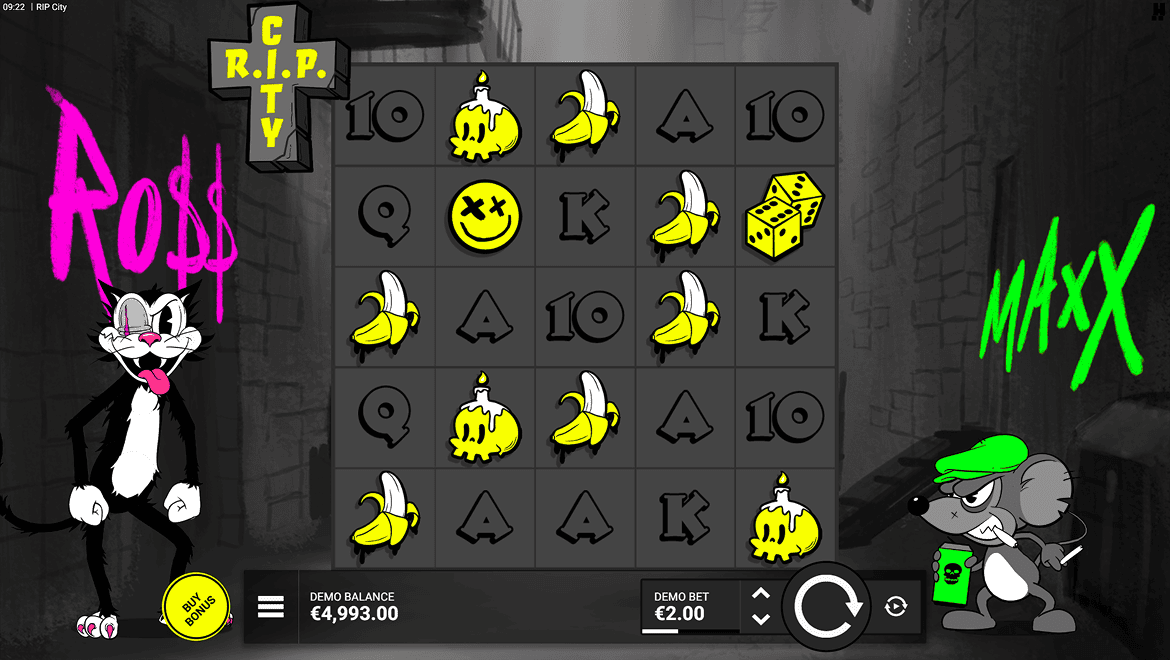 RIP City – мрачный и комичный игровой автомат, выполненный в анимированном стиле. Непокорный кот Ро$$ и сумасшедший мышонок Макс при каждом вращении создают хаос на барабанах. Когда функция «Дикий кот» активна, символы подстановки охватывают весь столбец и объединяются с множителями. Раунд «Бонус смерти» поднимает уровень адреналина на пик. RIP City с неоновыми эффектами, музыкой в стиле 80-х и бунтарской атмосферой — это городское приключение, наполненное весельем и выигрышами.