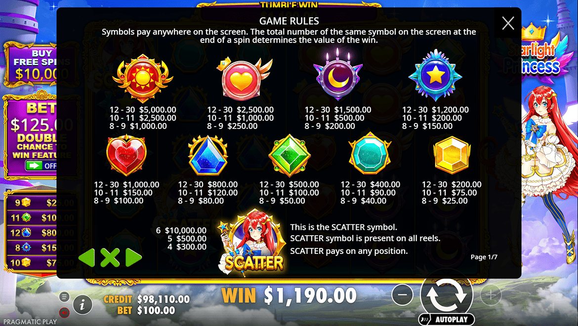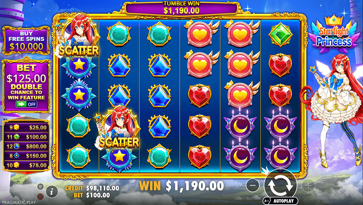 Starlight Princess — это слот, наполненный волшебством, светом и лёгким чувством сказки. Главная героиня — сияющая принцесса, которая щедро раздаёт множители и превращает обычные спины в фейерверк выигрышей. Атмосфера напоминает аниме-мир — с мягкими цветами, искрами магии и легкой мелодией, которая создаёт настроение ожидания чуда. Каждый спин здесь как вспышка звезды: ярко, динамично и с шансом на внезапный взлёт удачи. Starlight Princess — это слот, где магия встречается с азартом, а каждая победа ощущается как маленькое чудо с небес.