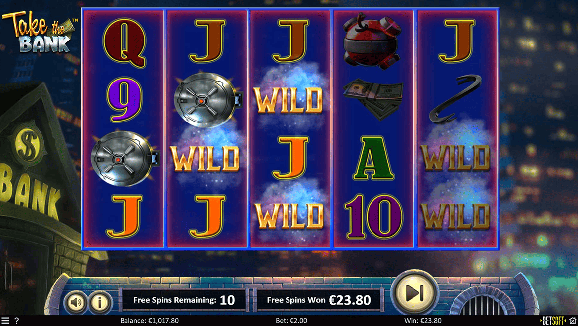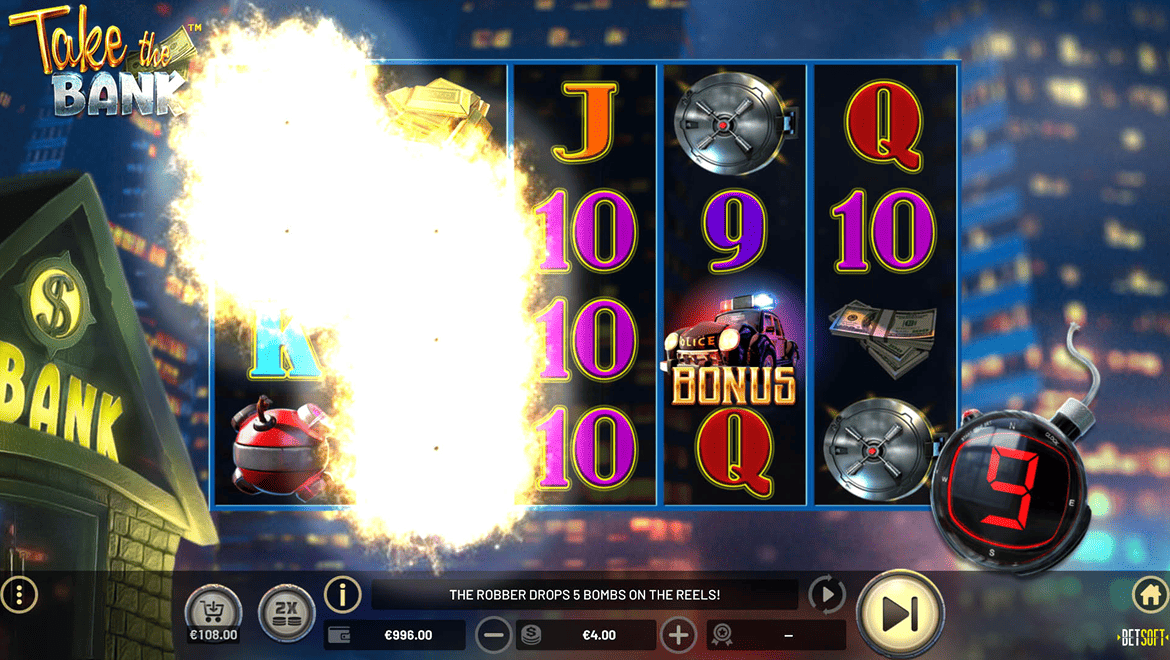 Take the Bank — это динамичный игровой автомат на тему ограбления банка. Символы вора в маске действуют как джокеры, а счетчики бомб увеличиваются с каждым вращением. В конце 10-го вращения бомбы взрываются, и выигрыш падает на экран. Автомобильные погони, звуки сирен и неоновые огни создают атмосферу боевика. Take the Bank благодаря своей веселой тематике и огромным множителям обеспечивает захватывающие адреналиновые победы.
