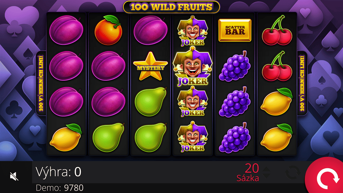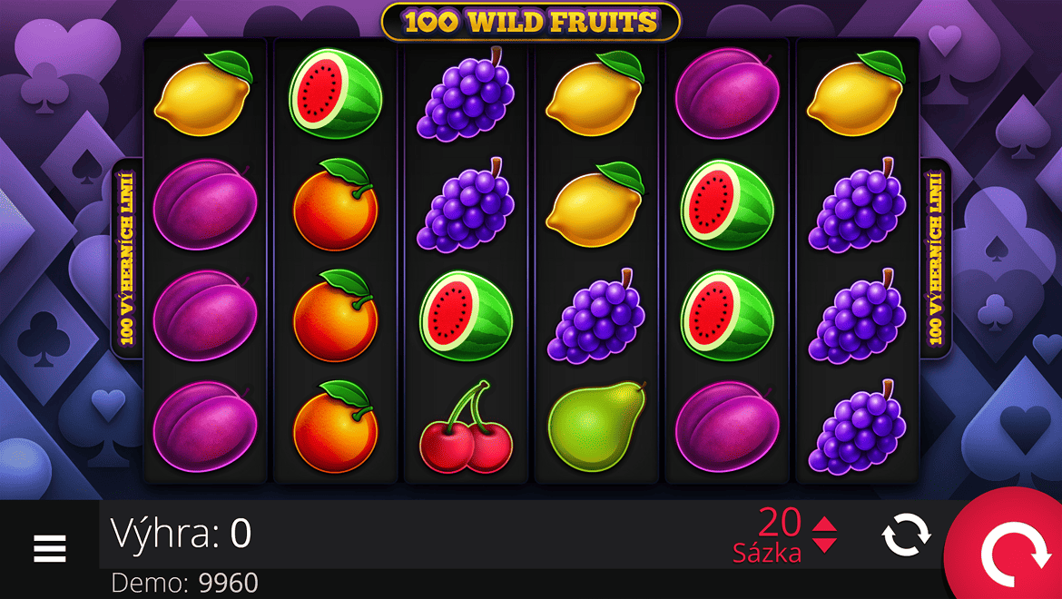 100 Wild Fruits brings a modern twist to classic fruit machines. Packed with sparkling cherries, lemons, watermelons, and star symbols, this slot offers big prizes with a full 100 paylines. Wild symbols complete all combinations to increase winnings. With its simple yet effective gameplay, it offers both a nostalgic feel and a dynamic pace. Featuring bright colors, lively sound effects, and high volatility, 100 Wild Fruits is the perfect choice for those seeking pure winning excitement.