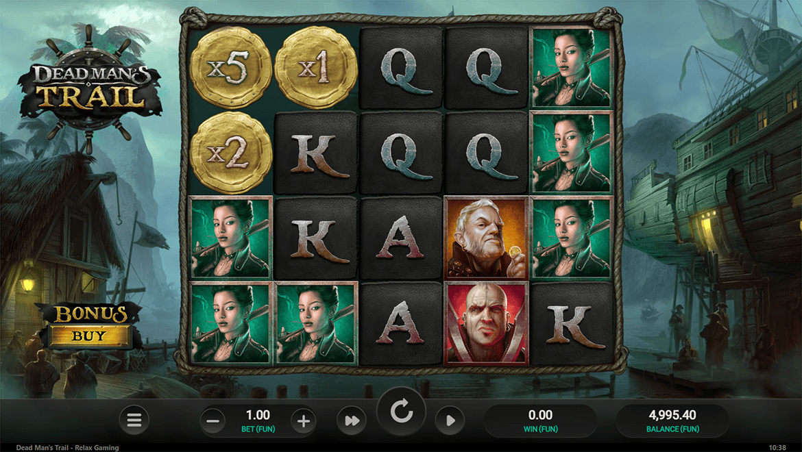 Dead Man’s Trail is a dark pirate-themed slot game set in dangerous seas. In the “Trail Bonus Game” feature, players advance across a map, encountering treasure chests, multipliers, and mystery boxes. “Persistent Collector” symbols continuously accumulate winnings. Detailed animations, sea storms, and cinematic music create an intense and suspenseful atmosphere. Dead Man’s Trail is a pirate legend that strikes the perfect balance between risk and reward.