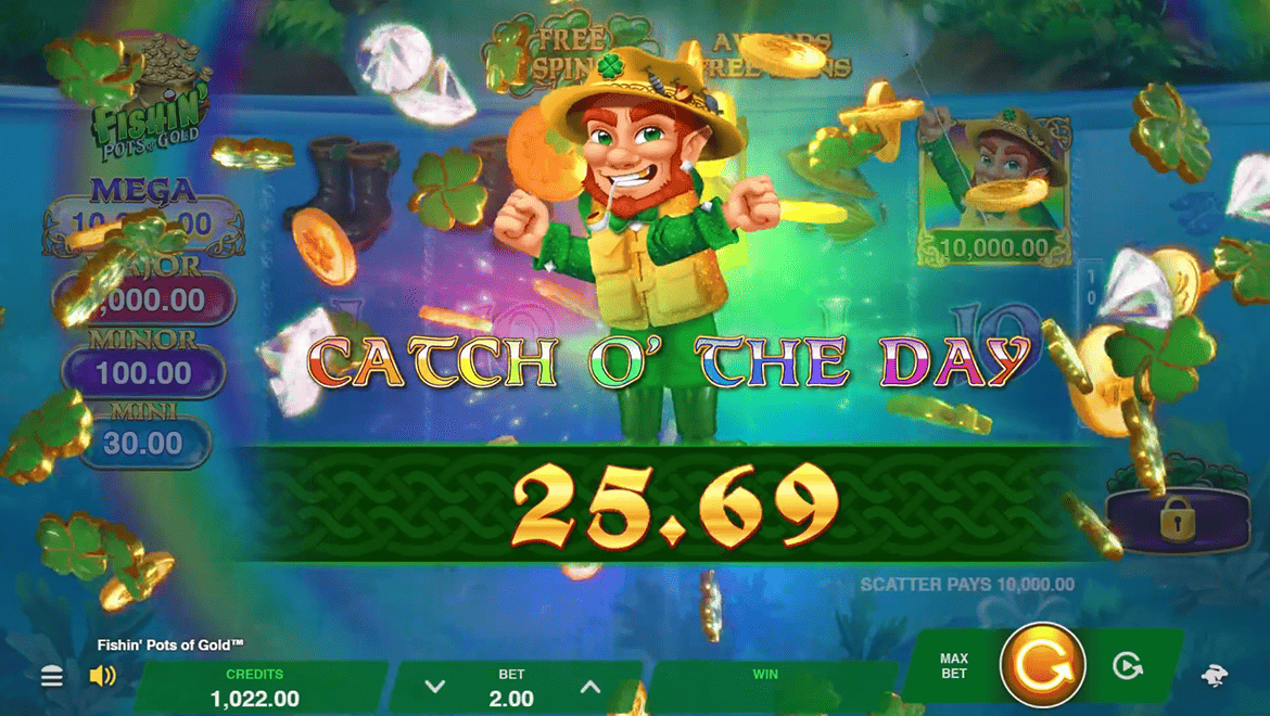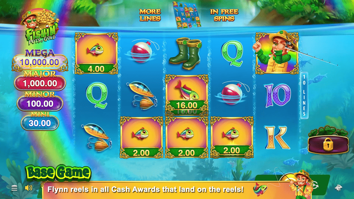 Fishin’ Pots of Gold is a fun slot game that combines fishing with Irish luck. The leprechaun character acts as a wild symbol and collects cash prizes with the fish symbols caught on his line. In the “Free Spins” feature, each new leprechaun increases the win multiplier. With colorful graphics, ocean-themed sound effects, and a cheerful atmosphere, the game is full of fun. Fishin' Pots of Gold offers both a relaxing and rewarding fishing experience.
