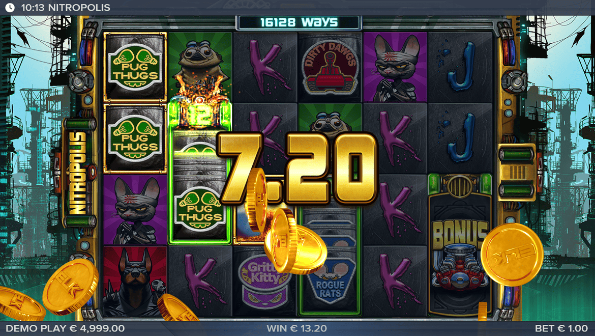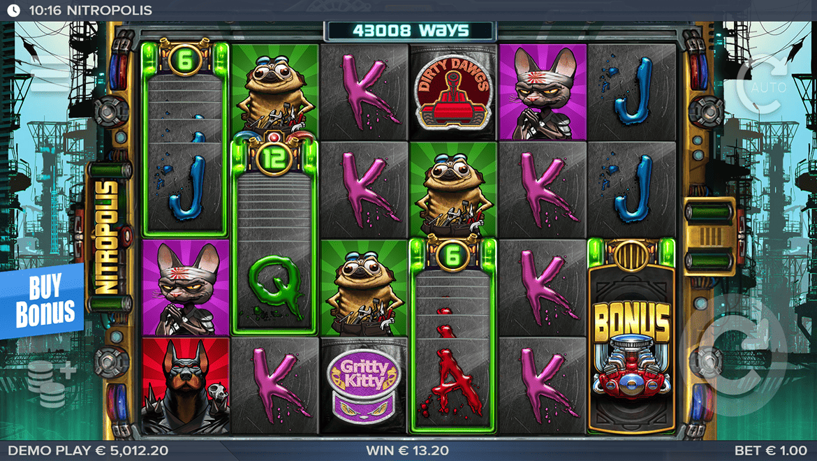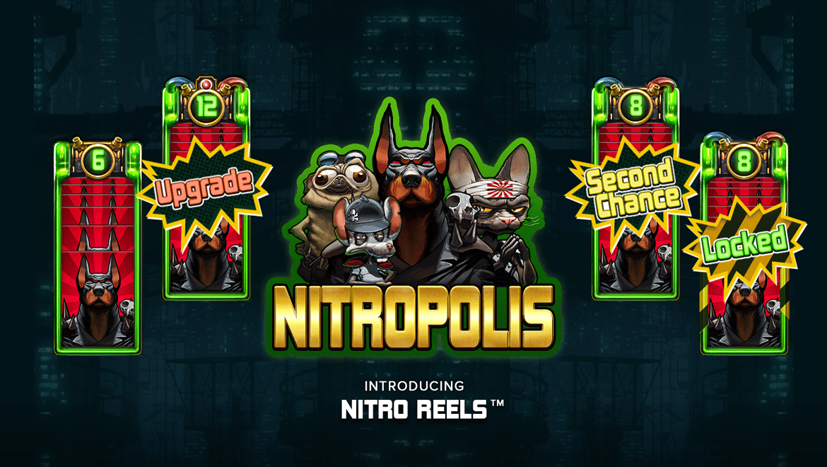 Nitropolis is a wild and energetic slot game set in a post-apocalyptic city. Nitro gangs—dogs, cats, and rats—appear on the reels, while the “Nitro Reels” feature creates new winning combinations with every spin. Expanding reels and re-spin features multiply the winning potential. With colorful neon effects, punk-style music, and a wild atmosphere, the game delivers a true adrenaline rush. Nitropolis is a legendary experience for players seeking speed, chaos, and big wins.