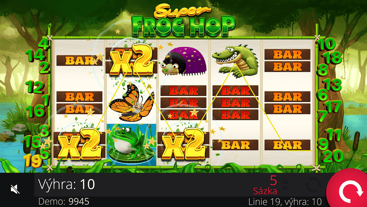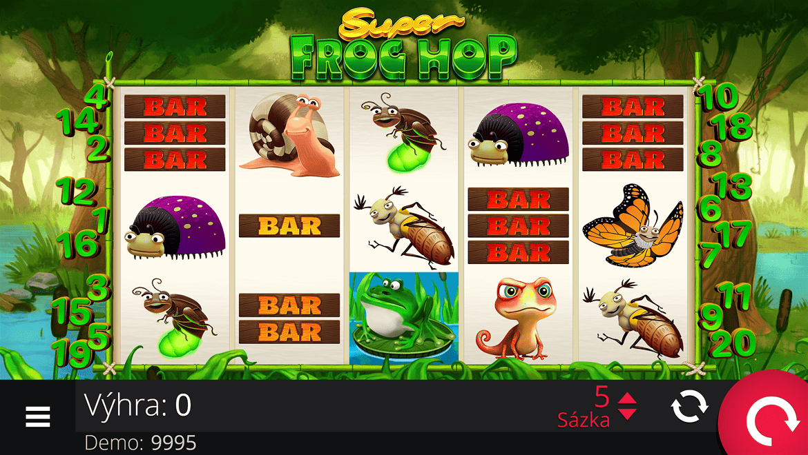 Super Frog Hop is a colorful and energetic slot game set along a riverbank. Winning combinations are formed with frogs, lily pads, and golden fly symbols. In the “Hop Bonus” feature, frogs leap onto the screen, leaving wilds behind and increasing winnings. Multiplier jumps during free spins add even more excitement. With its cheerful music, bright colors, and dynamic gameplay, Super Frog Hop is the perfect choice for those seeking both fun and winnings.