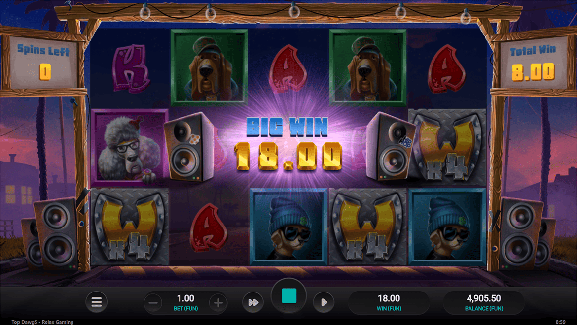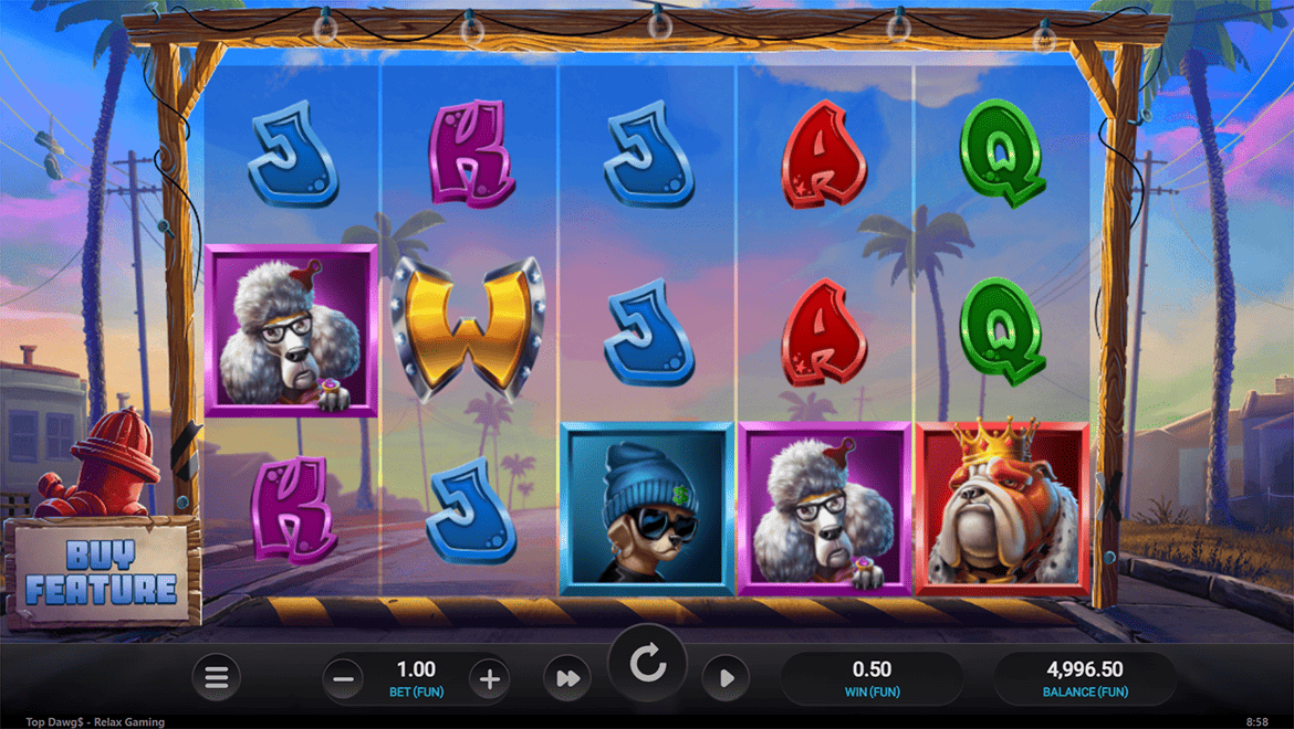 Top Dawg$ is a fun slot game that fills city streets with hip-hop energy. With the “Sticky Wild” feature, wild symbols stick to the reels, and each new wild increases the win multipliers. In the “Bonus Free Spins” round, collecting gold cassettes unlocks huge prizes. Colorful graffiti graphics, rap music, and humorous dog characters create a fun atmosphere. Top Dawg$ combines style and winnings in an energetic city adventure.