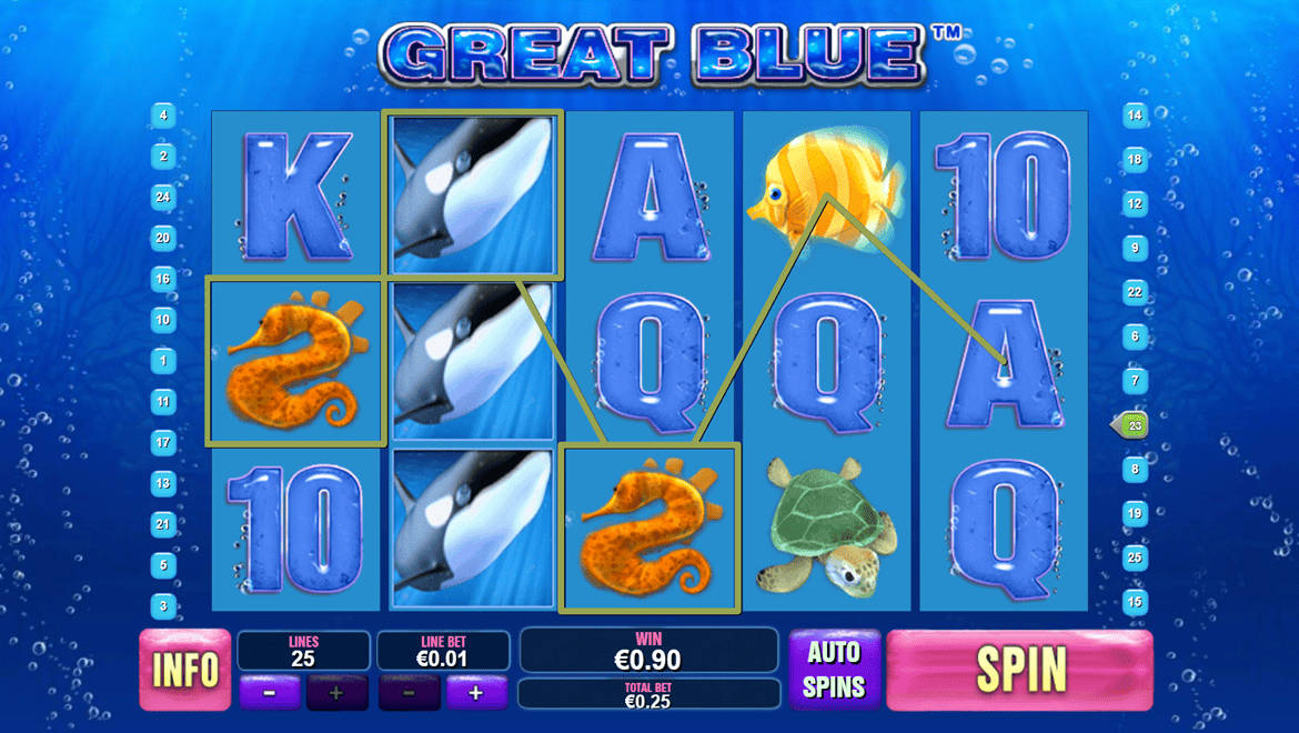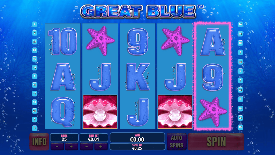 Great Blue, okyanusun derinliklerinde geçen mavi temalı bir maceradır. Balinalar, denizyıldızı ve inci kabukları kazanan kombinasyonlar oluşturur. İki inci sembolüyle başlayan bonus turunda oyuncular, çarpanı ve bedava döndürme sayısını belirlemek için mermileri seçerler. Vahşi balina sembolü tüm ödülleri ikiye katlar. Rahatlatıcı müziği ve canlı grafikleriyle Great Blue, hem rahatlatıcı hem de potansiyeli yüksek bir slot deneyimi sunuyor.