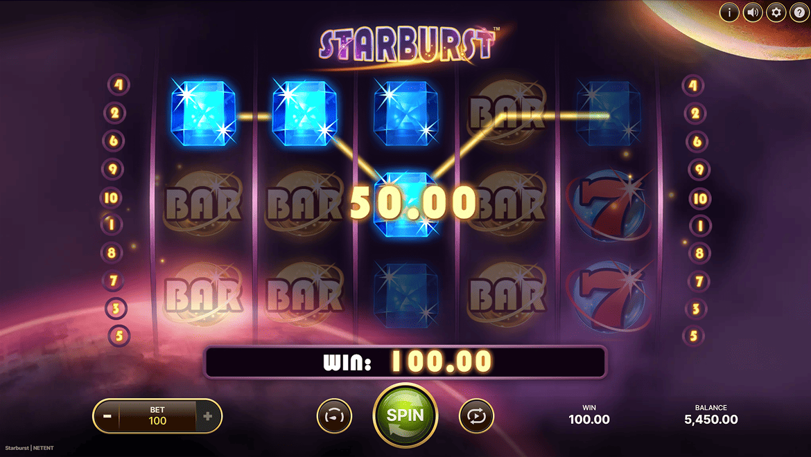 Starburst, evrenin ışıltısını makaralara taşıyan ikonik bir slot makinesidir. Renkli taşlar, yıldız sembolleri ve basit ama büyüleyici bir tasarım sunar. Wild sembolleri kazancı ikiye katlayarak hem sola hem de sağa ödeme yapar. Yüksek tempolu müzik ve kozmik atmosfer ile her dönüş galaktik bir ışık gösterisine dönüşüyor. Çekici sadeliğiyle Starburst, hem yeni hem de deneyimli oyuncular için eğlenceli bir oyun deneyimi sunuyor.